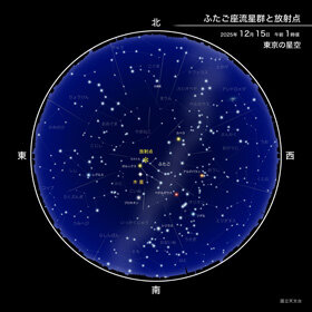 ふたご座流星群は3大流星群のひとつで、毎年12月中旬ごろに極大を迎える流星群です。毎年決まった時期に流星の数が多くなるものを流星群と呼び、ふたご座流星群のほかに、ペルセウス座流星群やしし座流星群などがあります。
