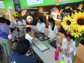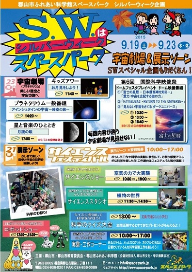 | 実験・工作コーナー | 10:00〜17:00 お祭りの屋台のような雰囲気で実験や工作をします。 ★ 9/19 光るスライム・偏光万華鏡(福島高校SS部), カラフルいくらを作ろう(郡山北工業高校自然科学部), スーパーボールをつくろう!・はずむシャボン玉をつくろう!(安積黎明高校化学部), イリュージョンカード(S.P.V) ★ 9/20 風船ロケット・クルクルみえルン♪コマ(福島高校SS部), カラフルいくらを作ろう(郡山北工業高校自然科学部), イリュージョンカード(S.P.V), 空気と生ゴム袋とビニール袋の関係(新福島芸能倶楽部), ★ 9/21 ぶっとびロケット(郡山萌世高校理科部), 不思議な木のおもちゃ(木のおもちゃ工房「あおむし」), イリュージョンカード(S.P.V), カラフル化石・ゆびごま(科学館) ★ 9/22 「だまされるな!!」〜五感の不思議(帝京安積高校理科研究部), 不思議な写真を撮ってみよう(福島大学spff), イリュージョンカード(S.P.V), 光るスライム・がりがりトンボ(科学館) ★ 9/23 スライム製作・プラ板キーホルダー・水中シャボン玉(日本大学東北高校理科部), 空気と生ゴム袋とビニール袋の関係(新福島芸能倶楽部), イリュージョンカード(S.P.V) ※工作は変更になる場合があります。 ※材料がなくなり次第終了となります。 ※SS…スーパーサイエンス, spff…ふくしまサイエンスぷらっとフォーム, S.P.V…スペースパークボランティアの会 |
