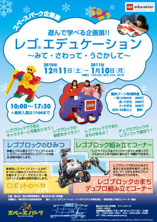 幼児から楽しめる大きなブロック「レゴソフト」や、ギアや滑車を使って動くものを組み立てられる「サイエンス&テクノロジーセット」など自由に体験でき、レゴブロックで作られたロボットも展示されます。ぜひ、今年の冬はスペースパークへお越しください。