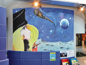 21階 展示ゾーンのキッズプレイス壁面に、「銀河鉄道999」の作品を展示しています。作品を見上げ、子どもたちが宇宙への遥かな夢を持ってほしいという願いを込めています。