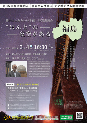 2023年3月5日・6日に全国の星空案内人(星のソムリエ®)が集まるシンポジウムが当館で開催されます。この機会に、改めて福島の星空の魅力や天文学の歴史を振り返る講演会を開催します。今回は福島県出身の天文学者で当館の名誉館長である渡部潤一先生からご講演いただきます。