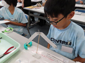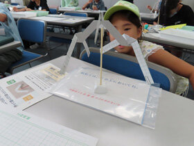 最初に、小野先生の「やじろべえはなぜ倒れないのか」という質問から、その理由を考え、理解することで、その特徴をとらえて、やじろべえ作りが始まりました。その後で工作用紙を利用したやじろべえ作りです。クラブ員は、正確に長さを計り、クリップを使ってバランスをとりながら仕上げていきます。大小さまざまなやじろべえや、2段3段に重ねたやじろべえなど、それぞれに工夫した作品ができあがりました。