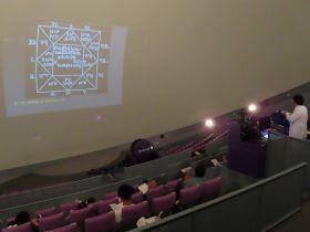 今回は宇宙劇場を会場に行いました。最初に、大きな話題となっている「レモン彗星」について、プラネタリウムの星空で見られる場所を再現しながら、観察のコツをご紹介しました。簡単に街なかで見られるほどの明るさにはなっていませんが、これまでの講座の知識と経験をもとに、双眼鏡などで観察にチャレンジしてみてください。