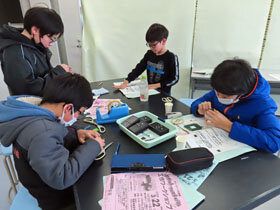 ほかにも、目の錯覚を利用したコマ「ベンハムのコマ」を作りました。白と黒の模様しかないのに、回すと茶色や青色などの光が見える目の錯覚を利用した不思議なコマです。色ペンを使用していないのに突然現れた様々な色に、クラブ員の皆さんは驚いていました。