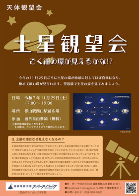 ・望遠鏡による土星や月の観察 ・星空の観察 など ※悪天候時は中止となります(開催は開始時刻の1時間前までに決定します)。 |