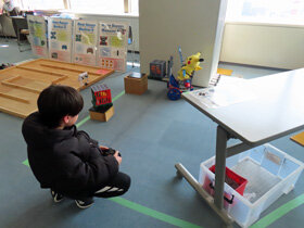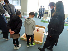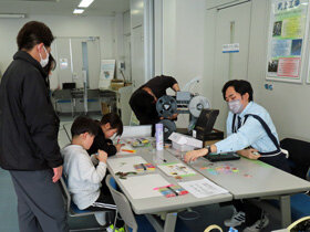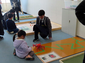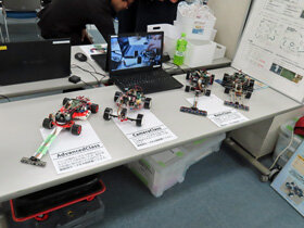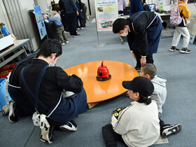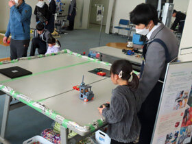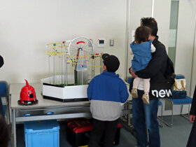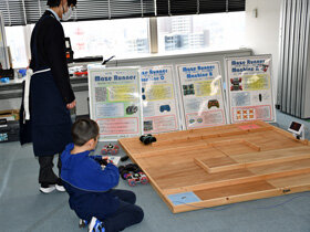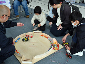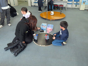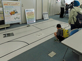 ライントレースカーは、床面の黒い線をセンサで読み取って、線に沿って走ることができる車です。操縦をしなくても線に沿って走る車を、来館者の皆さんは興味深く見入っていました。