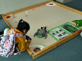 物陰などで光が当たらないと停止したままですが、光が当たると動き出すロボットです。庭石を動かした時に、その下のダンゴムシが動き出すイメージで、フィールドのフタをどけるとロボットたちが一斉に動き出していました。特に、ロボット操縦が難しい小さなお子さんに大人気でした。