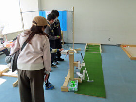 パターゴルフが打てるロボットです。まず、レバー操作でロボットがゴルフボールを置いてくれます。そして、別のレバー操作でゴルフクラブを振りかぶる高さを調整して打つ強さを決めます。最後のレバー操作でボールを打ちます。来館者の皆さんは、得点の高い位置にうまくボールを止められるか、何度も挑戦していました。