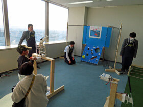 ピンポン玉を発射できるロボットです。ピンポン玉を発射する向きを、レバー操作で上下左右調整して発射します。発射する先には穴が空いた的があり、より小さい穴に多く入れるほど高得点になります。来館者の皆さんは、高得点目指してがんばっていました。