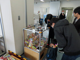 クレーンを操作して、ロボットの手を使ったお菓子のつかみ取りに挑戦してもらいました。お菓子がもらえるとあって、皆さん真剣にがんばっていました。