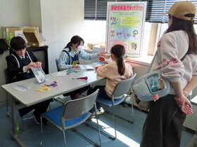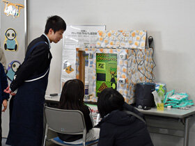 高校の課題研究として、生徒の皆さんがUnityというゲームエンジン(ゲームを制作するソフトウェア)を使ってアーケードゲームを一から製作しました。ソフトウェアだけでなく、ゲーム機本体も高校生による製作で、木材を加工し液晶モニターやスピーカーを組み合わせ作られています。ゲーム内容は、6個のボタンを流れる音楽に合わせて、タイミング良くボタンを押すゲームです。多くの方が挑戦していました。
