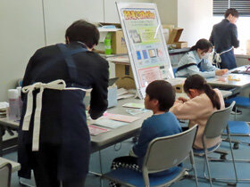 紙切りというと、一般的には高度な技術を持った紙切職人が、ハサミを使って様々な絵を切り出す様子を楽しむ伝統芸能です。ここではカッティングマシンを使うことで誰でも比較的簡単にきれいに作品を作れます。来館者の皆さんには、カッティングマシンが作った切り絵を、粘着力の弱いのりで別の紙に貼り付け、切り絵のみを残すように周りを竹串で取り除いてもらいました。