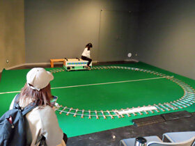 電気で動く鉄道です。車体は木製ですが、台車や車輪は3Dプリンターで製作されています。ボタン1つで出発・停止することができるほか、線路の途中に配置された二次元コードを読み取ることで、電車の発車音や音楽が流れるようになっています。こちらも小さなお子さんに大人気でした。